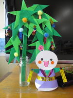 スタイロフォーム(発泡スチロールのようなもの)をカッターで削ってヤスリがけした後、絵の具で色をつけています。木の色は茶色ではなく本物の木に近い(木の種類にもよりますが)色をつけています。葉の部分は新聞紙に広げたティッシュに緑やきみどりの絵の具で色をつけた後、ドライヤーで乾かして、ちぎったものをのりでつけています。ちょっと手間はかかりますがその方が色紙を使うよりもリアルな葉っぱの感じが出せます。