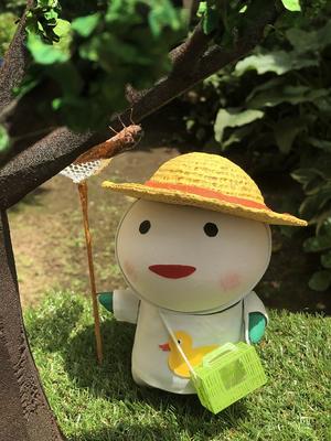 子供の頃は夏はランニングで虫取りをする子もいましたが、はらまっちにランニングは似合いそうもない(肩もないし…)ので、Tシャツにしました(園服みたいに見えますか一応Tシャツです…)。シャツの柄は「カエル」にしようかとも思いましたが(顔がなんとなくかぶってしまうので…)結局「アヒル」にしました。アヒルのところだけ厚紙に描いてワッペンのようにつけています。