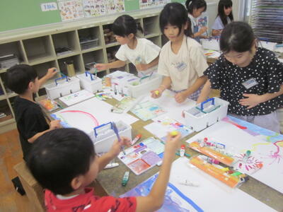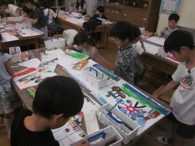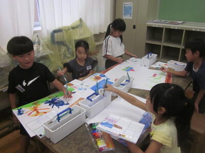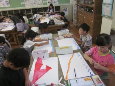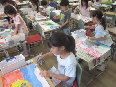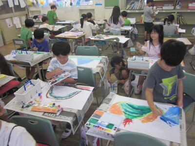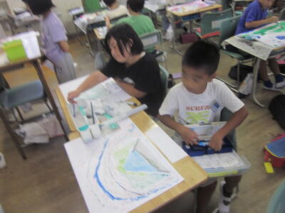 2年生は、図工で「えのぐじま」のテーマで絵を描きました。