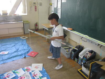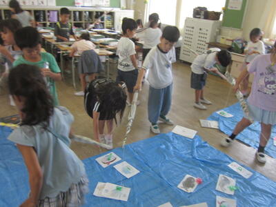 習字の筆を使って字を書いて、さらに絵の具で絵も加えます。