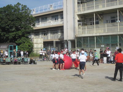 白組紅組、それぞれ力を合わせて大玉を送ります。